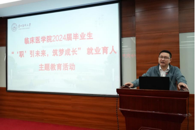 鄂州市中心医院住培办主任黄庆勇进行宣讲,通过观看医院住培招生宣传片,并围绕基地概况、住培制度、教学团队、培训效果、学员待遇及“两个同等对待”政策等方面向同学们进行讲解。
