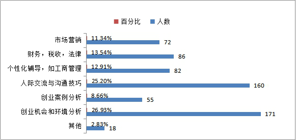 参与调研的635名员工中,希望学校开设创业指导课程更注重哪些发面的调查(可多选):市场营销的72人,占比11.34%;财务,税收,法律的86人,占比13.54%;个性化辅导,如工商管理的82人,占比12.91%;人际交流与沟通技巧的160人,占比25.20%;创业案例分析的55人,占比866%;创业机会和环境分析的171人,占比26.93%;其他的18人,占比2.83%。