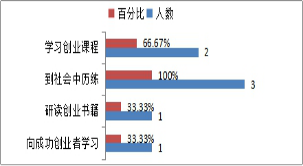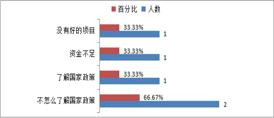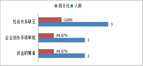 参与调研的3名自主创业员工中,自主创业过程中遇到的困难调查(可多选):社会关系缺乏的3人,占比100%;企业创办手续审批的2人,占比66.67%;资金筹备的2人,占比66.67%。