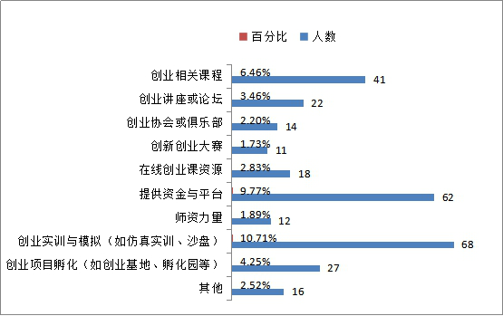 参与调研的635名员工中,对母校提供的创业教育/指导服务最需要改进的方面调查(可多选):创业相关课程的41人,占比6.46%;创业讲座或论坛的22人,占比3.46%;创业协会或俱乐部的14人,占比2.20%;创新创业大赛的11人,占比1.73%;在线创业课资源的18人,占比2.83%;提供资金与平台的62人,占比9.77%;团队力量的12人,占比1.89%;创业实训与模拟(如仿真实训、沙盘)的68人,占比10.71%;创业项目孵化(如创业基地、孵化园等)的27人,占比4.25%;其他的16人,占比2.52%。