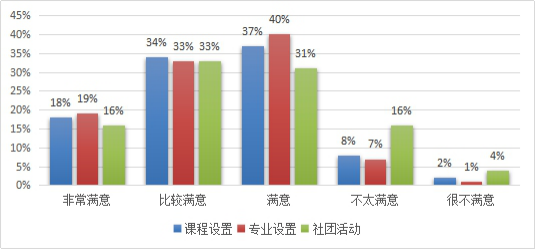 毕业生对母校人才培养的满意度的调查将有利于不断完善学院人才培养机制。333体育2018届毕业生对母校人才培养的满意度从3个方面来调查。课程设置满意度为89%,专业设置满意度为92%,社团活动满意度为80%。课程设置和团体活动满意度不是太高。