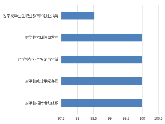 其中用人单位对学校招聘信息发布的满意度为100.00%、对学校招聘活动组织的满意度为100.00%、对学校就业手续办理的满意度为100.00%、对学校毕业生鉴定与推荐的满意度为100.00%、对学校毕业生职业教育和就业指导的满意度为98.52%。