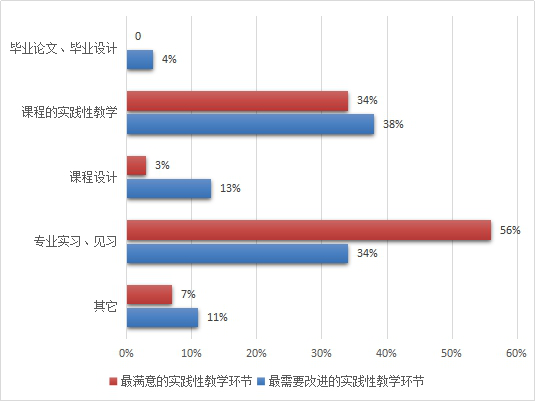 医学专业的员工特别强调实践教学的重要性。实践性教学环节满意度最高的是专业实习、见习,其次是课程的实践性教学。但是在最需要改进的实践性教学环节比例最高的也是专业实习、见习,其次是课程的实践性教学。可见专业实习、见习为最需要加强的实践教学环节。