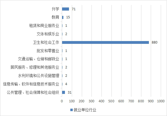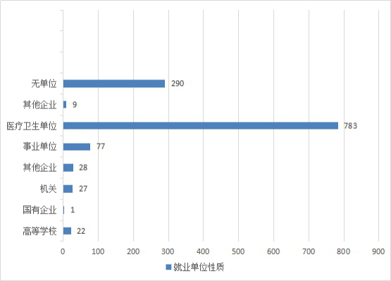 根据贵州省大中专毕业生就业信息管理系统统计数据显示,截止2018年11月30日,333体育2018届本科毕业生中,已就业的1012人,从就业单位性质看,从事人数最多的行业类别为卫生和社会工作,共计783人,所占比例约为77.4%;事业单位的77人,占比7.7%;其他企业28人,占比2.8%;机关27人,占比2.7%,高等学校22人,占比2.2%;国有企业1人,占比0.1%,其他9人,占比0.9%。