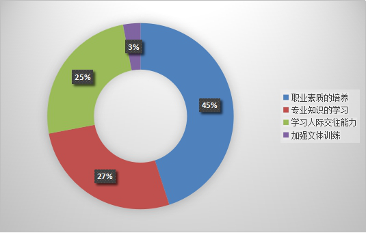 用人单位表示公司毕业生应重点加强的是:职业素质的培养为45%,其次是专业知识的学习为27%,学习人际交往能力为25%,加强文体训练为3%。