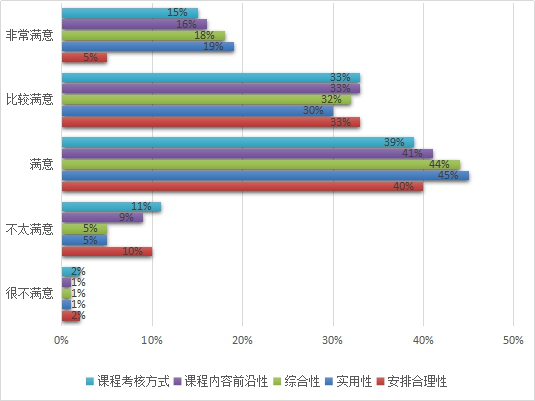 毕业生对所学专业的课程设置情况的评价对学校专业结构的调整、培养方案的优化、课程设置的改进等方面具有重要的决策参考意义。333体育2018届毕业生对所学专业的课程设置的满意度从5个方面进行调查。综合性满意度为94%,实用性满意度为94%,课程内容前沿性满意度为90%,课程考核方式满意度为87%,安排合理性满意度为78%。