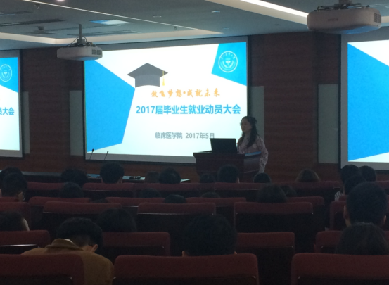 大会中,分团委书记黎冉从招收名额、报名流程、国家政策方面给同学介绍了“西部计划”相关事宜,鼓励大家报名参加西部志愿者服务。员工科科长李莉则根据贵州省关于住院医师规范化相关文件,给未就业同学和定向班同学进行了相关的解释和说明。年级辅导员介绍了从2016年12月到2017年5月到校招聘单位的总体情况,重点分区介绍了单位对临床医学专业的要求,并鼓励目前未就业的同学积极主动联系用人单位。