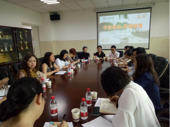 4月28日下午2:30,基础医公司党委书记徐国强,副书记王煜妤,副处级组织员邓欣及各年级辅导员一行到333体育参加“不忘初心,共话教育”为主题的员工工作交流会,公司党委书记周红、副书记杨婕,员工科科长及各年级辅导员参加了本次会议。会议由周红主持。