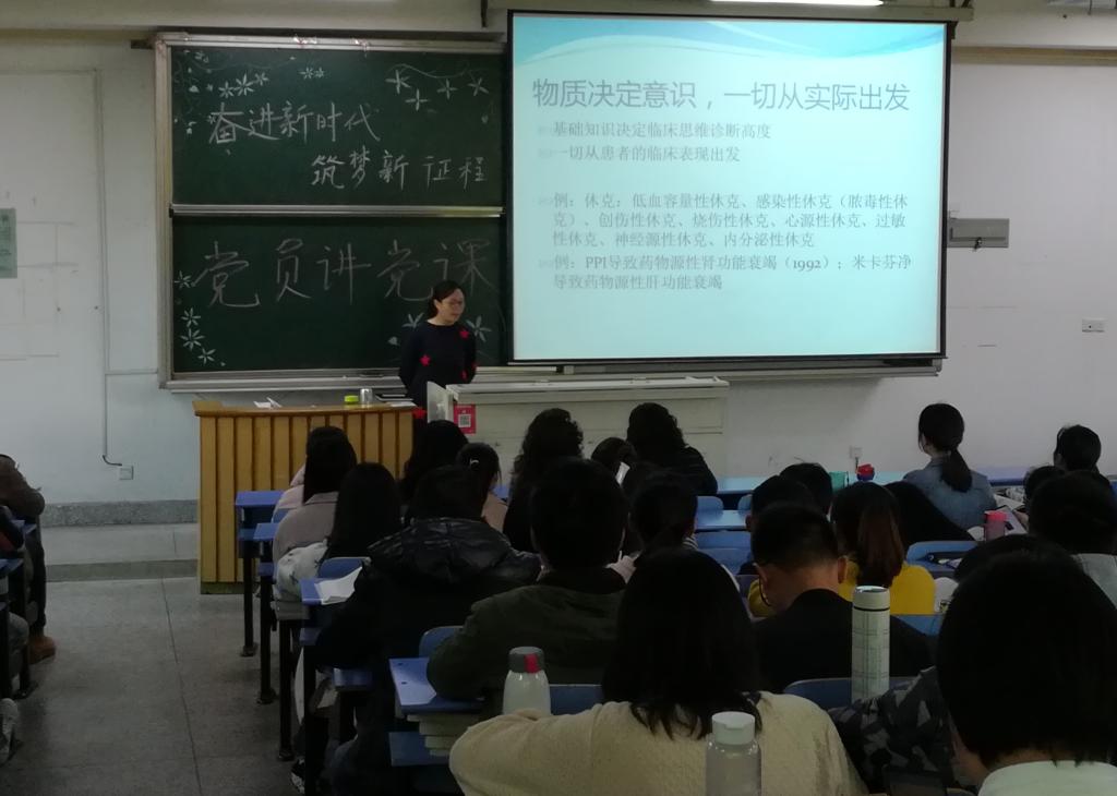 周红作总结,她指出党课是中国共产党长期以来的光荣传统,是从严治党的重要法宝。作为一名党员应该不忘初心,牢记使命,认真贯彻学习习近平新时代中国特色社会主义思想,并将学习到的先进理论应用于临床实践中。希望同学们要不断学习新的知识,充实自我,提高自己的党性修养。