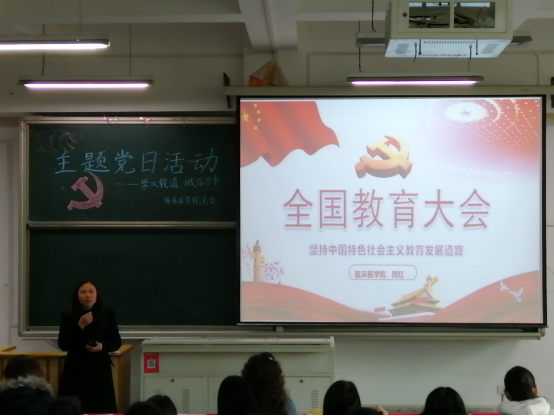 此次党员主题活动在庄严的国歌声中拉开序幕,周红书记带领大家以“坚持中国特色社会主义教育发展道路”为主旨深入学习领会习近平总书记在全国教育大会上的重要讲话精神。周书记从“坚持党对教育事业的全面领导,坚持把立德树人作为根本任务、坚持优先发展教育事业、坚持社会主义办学方向、坚持扎根中国大地办教育、坚持以人民为中心发展教育、坚持深化教育改革创新、坚持把服务中华民族伟大复兴作为教育的重要使命、坚持把教师队伍建设作为基础工作”等九个坚持结合医员工学习生活等具体实际进行了详细阐释。在谈到“坚持深化教育改革创新”时,周红书记勉励在场员工党员积极报名参加第十届全国临床技能大赛,力争通过自身刻苦努力取得优异成绩,积极发挥党员先锋模范作用,为身边同学树立创优争先的学习榜样。周红书记还强调期末考试临近,全体员工党员要诚信考试,考场上要自觉佩戴党员徽章,时刻以共产党员的标准严格要求自己,发挥表率作用。
