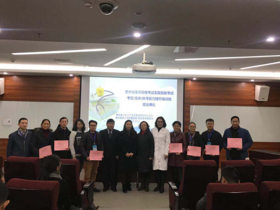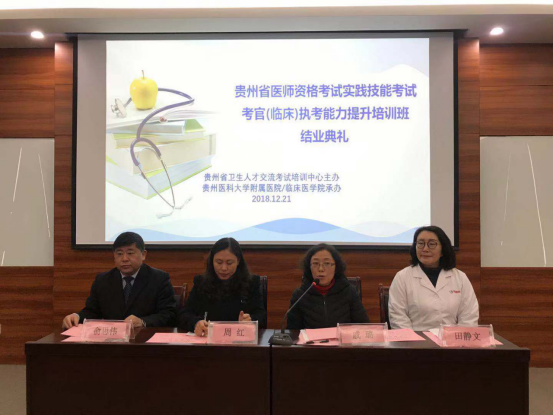 12月21日,2018年贵州考区国家执业医团队格考试实践技能考试考官(临床)执考能力提升培训班(二期)结业典礼在333体育官网临床技能中心208举行,来自贵州九个市州考点的60名考官顺利结业。公司党委书记周红、临床技能中心主任田静文、临床技能中心俞思伟出席培训班,由333体育副经理戚璐主持结业典礼。