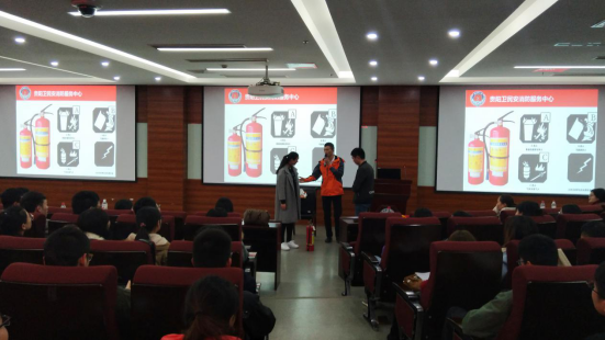 杨万义教官结合近年来火灾案例,通过播放火灾现场视频、展示火灾事故图片、现场与同学互动等方式,向全院师生介绍了引发火情的原因及造成的危害,详细讲解了发生火灾后的自防、自救及逃生技能,通过现场演示,指导大家如何使用灭火器、安全锤等有关消防器具。最后,杨教官针对日常工作中所遇到的消防问题与大家进行互动,为大家进行了详细解答。