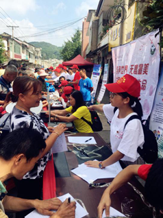 24日上午志愿队到达黔西县铁石乡,在乡政府及团委的大力协助下,开展“同在一个世界 同禁万恶毒源 同享光明人生”禁毒知识及员工资助政策宣传活动。在为村民发放关于印制宣传禁毒知识的小扇子、气球、购物袋及纸巾盒的同时进行禁毒知识问答抽奖环节增强群众的禁毒意识,并且就国家及学校相关的资助政策对当地乡民进行讲述,提高政策知晓度,鼓励乡村贫困家庭支持子女接受更高层次教育。志愿队还对乡民进行义务诊疗,为乡民进行视力、色觉检查,血压、血糖测量,地区常见病、多发病的问诊解答等,为助力“健康贵州”社会公益做出贡献,弘扬医员工无私奉献、严谨求实的精神;为基层群众带去健康、科学的生活理念,产生了良好的社会影响。