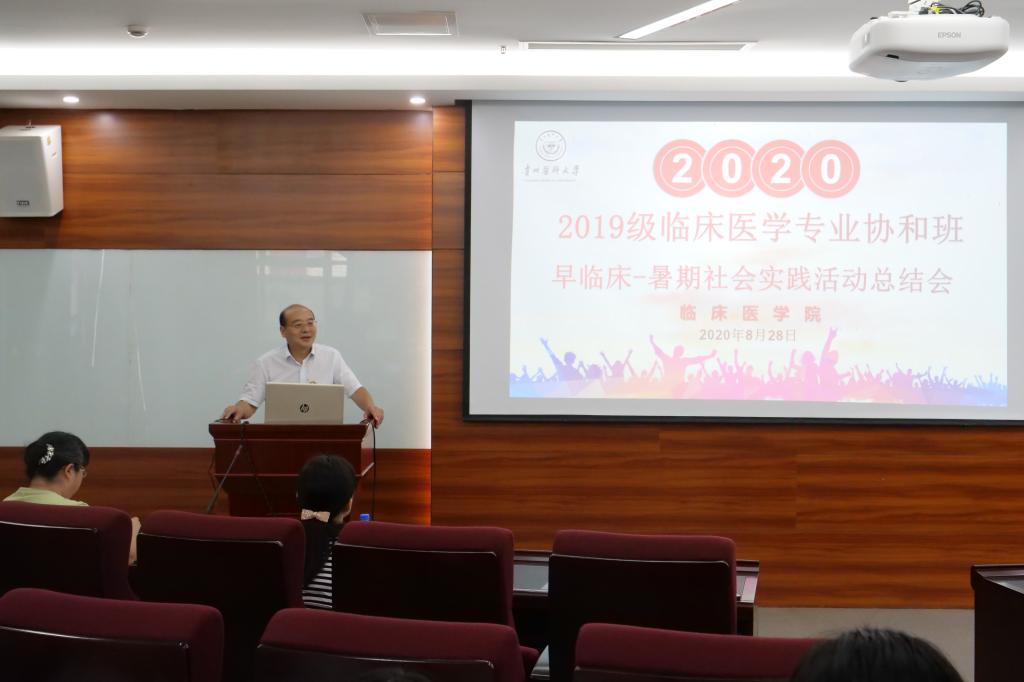 8月28日,333体育在临床技能中心208室召开2019级临床医学专业协和班早临床-暑期社会实践活动总结会。教务处处长温小军、333体育班子成员、相关职能科室及2019级临床医学专业协和班全体员工参加了总结会。会议由2019级临床医学专业协和班张玉典同学主持。