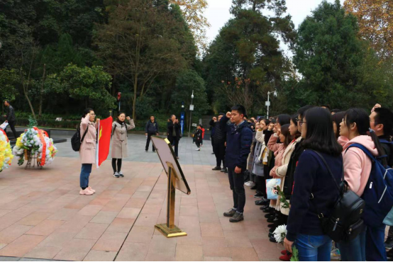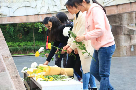 全体党员来到纪念碑前,面向党旗,高举右手,庄严宣誓,重温入党誓词,并集体朗诵革命诗歌《忆秦娥·娄山关》,《七律·历史转折》以及《可爱的中国》,感悟革命历程之艰辛,缅怀先烈之精神。随后,党员代表到墓碑前敬献鲜花以表哀思。