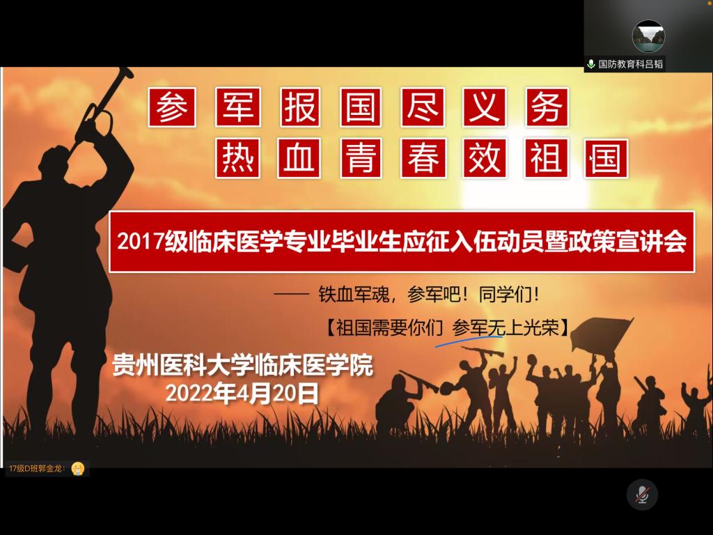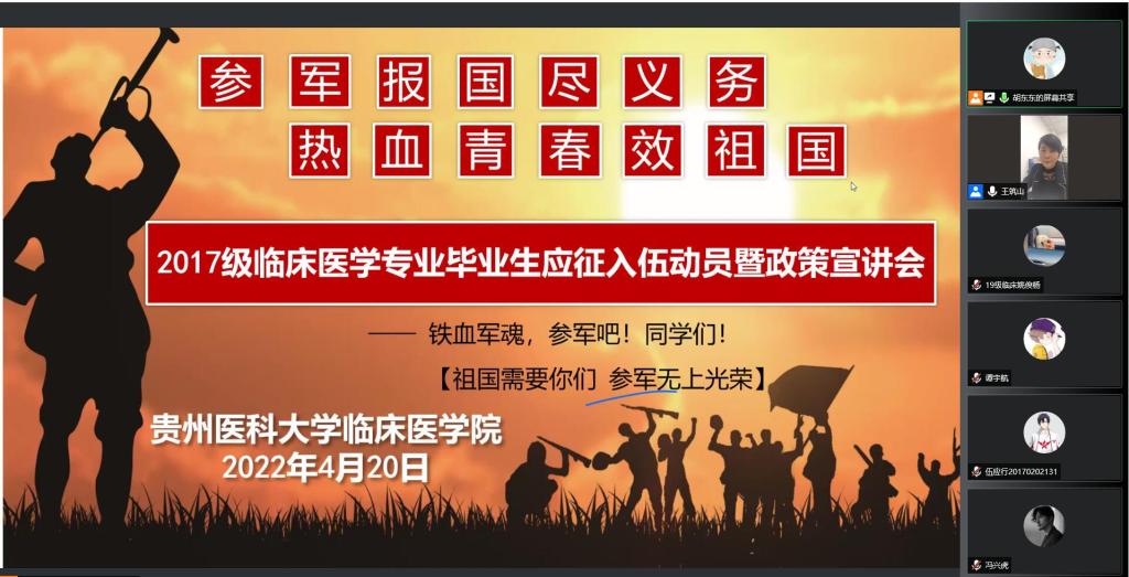 4月21日,333体育采取线上会议形式,召开临床医学专业2017级毕业生应征入伍动员会暨政策宣讲会。公司党委副书记王筑山、党委员工工作部国防教育科科长吕韬、333体育员工科科长李莉、毕业班辅导员、2名优秀退役老员工及全体适龄男青年参会。