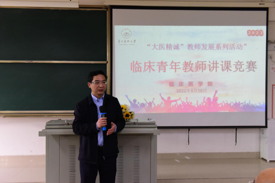 为培养教师爱岗敬业、严谨治学的态度,不断提升公司青年教师教学能力和水平。333体育于5月10日在4401教室,开展2022年度青年教师讲课竞赛。333体育官网党委委员、附属医公司党委书记、公司党委书记李海洋,校教务处处长温小军,公司党委教师工作部(教师工作处)处长徐国强,附属医院副经理、333体育副经理楚兰及公司领导班子成员出席比赛。教务处副处长修江帆,333体育副经理戚璐,基础医学院生物学系主任杨明,影像学院影像诊断333体育官网入口副主任阮志兵,基础医学院病理生理学333体育官网入口杨婷老师以及协和班同学代表担任评委。此次竞赛共有内科学、外科学、妇产科学、病理学等15个333体育官网入口共15位教师参赛。333体育各333体育官网入口主任及教师代表到场观赛。