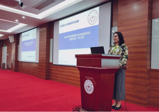 会上,临床技能中心主任、总考官田静文进行考官培训,培训结束后全体考官参加了考官考试及分站考官执考培训。