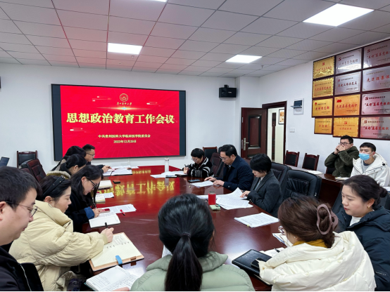 李海洋指出,公司党委高度重视思政工作。近年来,在公司党委行政的领导下,学院以推动“院院合一”工作为抓手,思政工作体制机制日趋成熟和完善,逐步形成了具有临床特色的思政工作经验。李海洋强调,要以更高标准和更严要求全面推进学院思想政治教育工作,加强引导、管好阵地,向员工传递正能量,引导员工树立正确的理想信念和价值观念。要把坚持目标导向、问题导向的要求贯穿始终,着力提升员工培养成效,在强化临床“三基”、促进优质就业、提高执医过关率等方面突出工作实效。要把主题教育学习成果转化为干事创业的强大动力,建强员工管理队伍,创新思政工作方法,营造活跃校园氛围,引导员工德智体美劳全面发展。要进一步强化协同联动,坚持系统观念,着眼于总结新经验、谋划新篇章,在“重改革”中推进医教研协同发展及“院院合一”管理体制创新和落实,以高质量党建引领学院思政工作高质量发展,为建设“百年贵医”贡献力量。