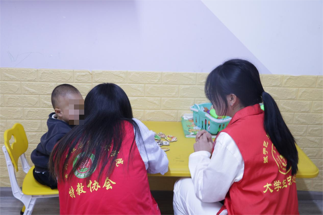 座谈会结束后,志愿者们便开始了儿童康复志愿服务之旅。第一站,志愿者们走进了星爱婴康复中心,在这里志愿者们与特殊儿童们进行了接触,加入到了他们的康复训练过程中,积极的了解每个孩子的情况后,分组与贵工程特教协会的志愿者们针对性的对每个孩子开展了相关康复训练,将康复治疗相关知识与特殊教育融合,为小朋友们设计有趣的康复训练,帮助他们早日回归正常生活。