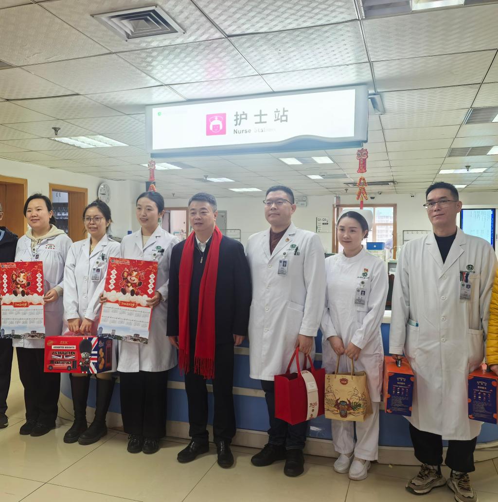 慰问过程中,李海洋与实习员工进行了亲切交谈,详细询问了同学们在实习期间的学习内容、实践操作、日常生活及学业进展等情况,认真倾听同学们在实习过程中的收获与感悟以及遇到的困难和挑战。左石看望了春节仍在岗工作的规培生,详细询问了员工的工作、学习和生活情况,为他们送去春节礼品及新春祝福。