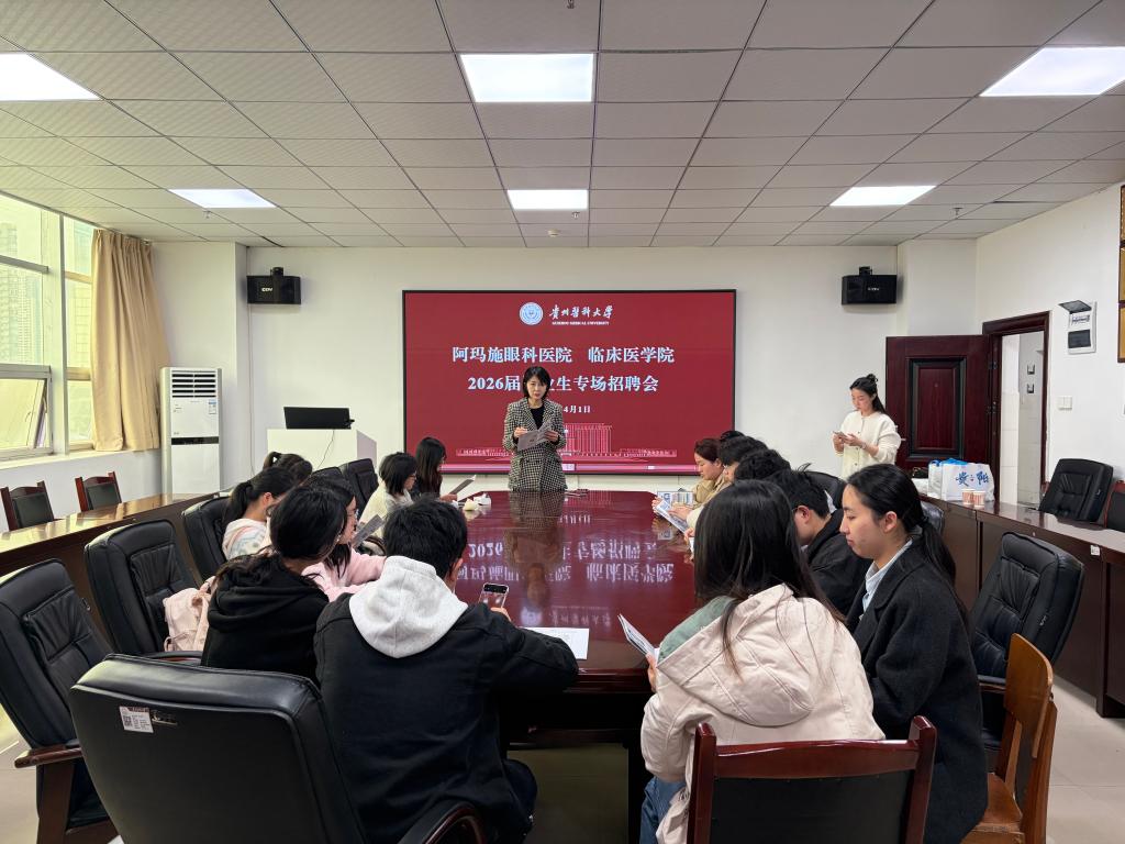 招聘会上,潘腾宇介绍了医院发展历程、岗位需求及人才培养体系,重点回顾了2024届、2025届本校员工招聘情况。目前医院在贵阳设立渔安院区和金阳院区两个基地,对应届毕业生不设执业证书硬性要求。针对眼视光专业员工,主要招聘门诊医师岗位,负责患者术前检查、验光及门诊诊疗工作。