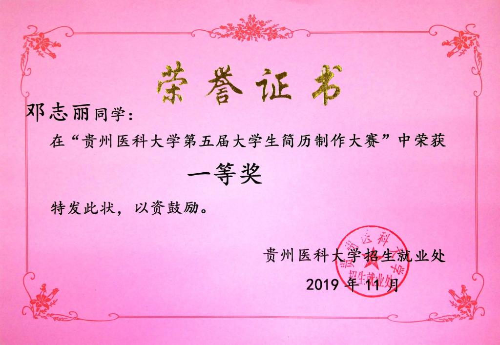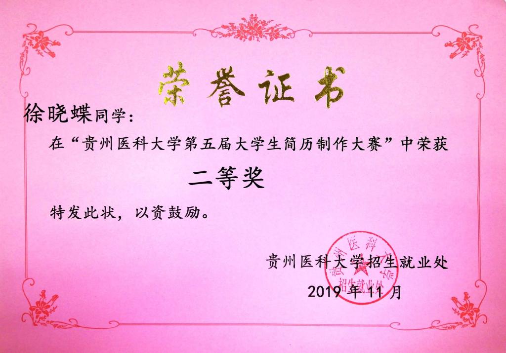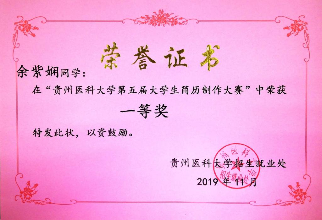 2019年11月,公司举办第五届老员工简历制作大赛,在本次大赛中,公司员工积极参加,认真准备,充分展现了老员工朝气蓬勃的精神风貌,充分展现了当代青年人的职业新人形象。在坚持公平、公正、公开的原则下,公司推选2016级5名员工优秀作品参加并取得成绩如下:B班黄涛、E班余紫娴、E班邓志丽获一等奖,F班徐晓蝶获二等奖。在此,特向全院师生报喜!并希望全体师生再接再厉,在以后的各种赛事中,勇创佳绩,再续辉煌!